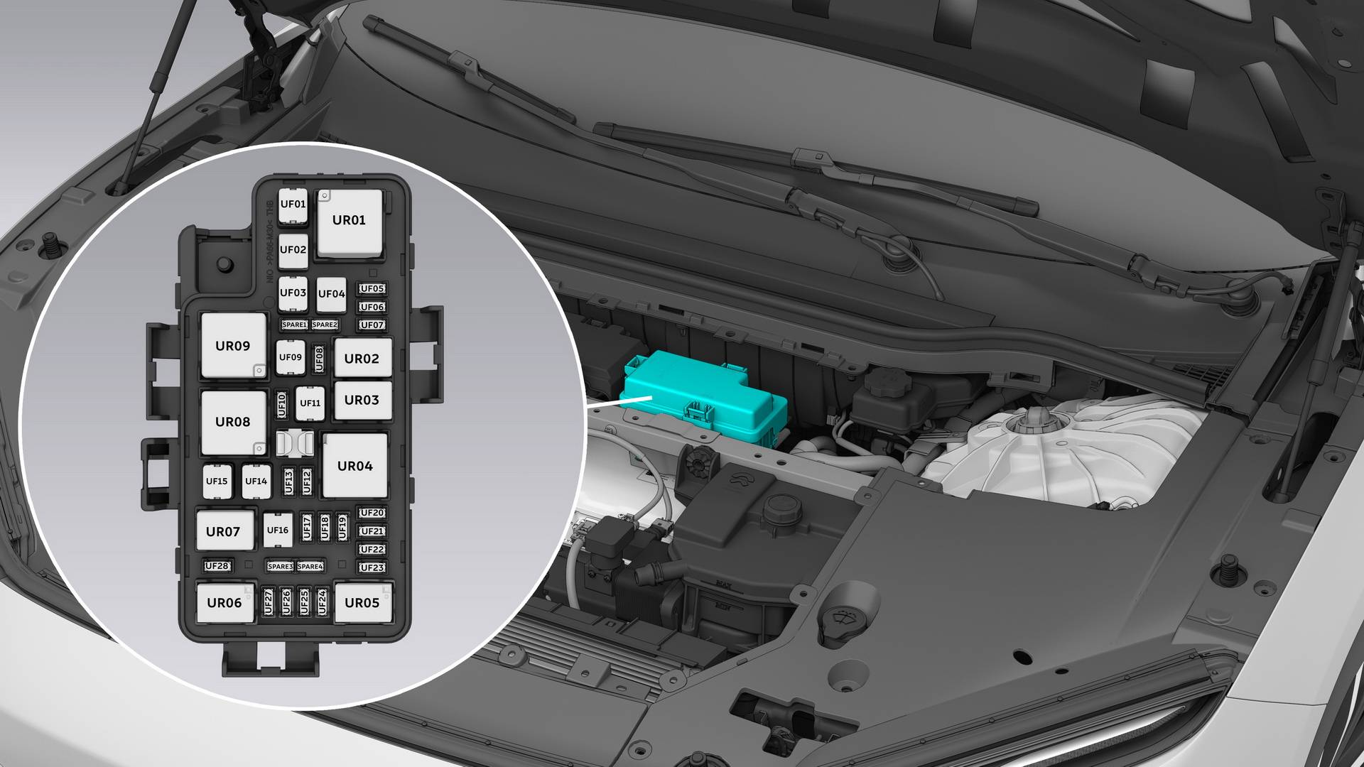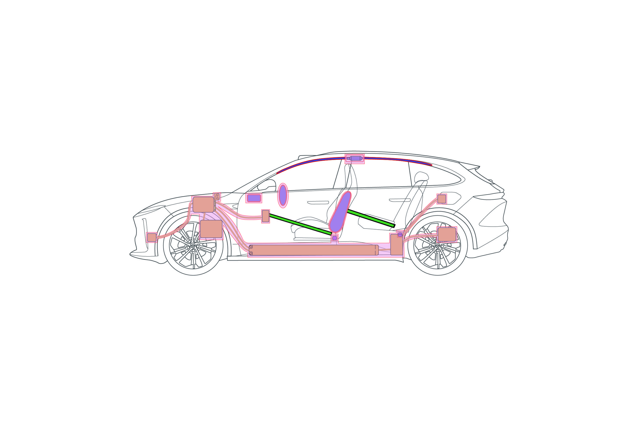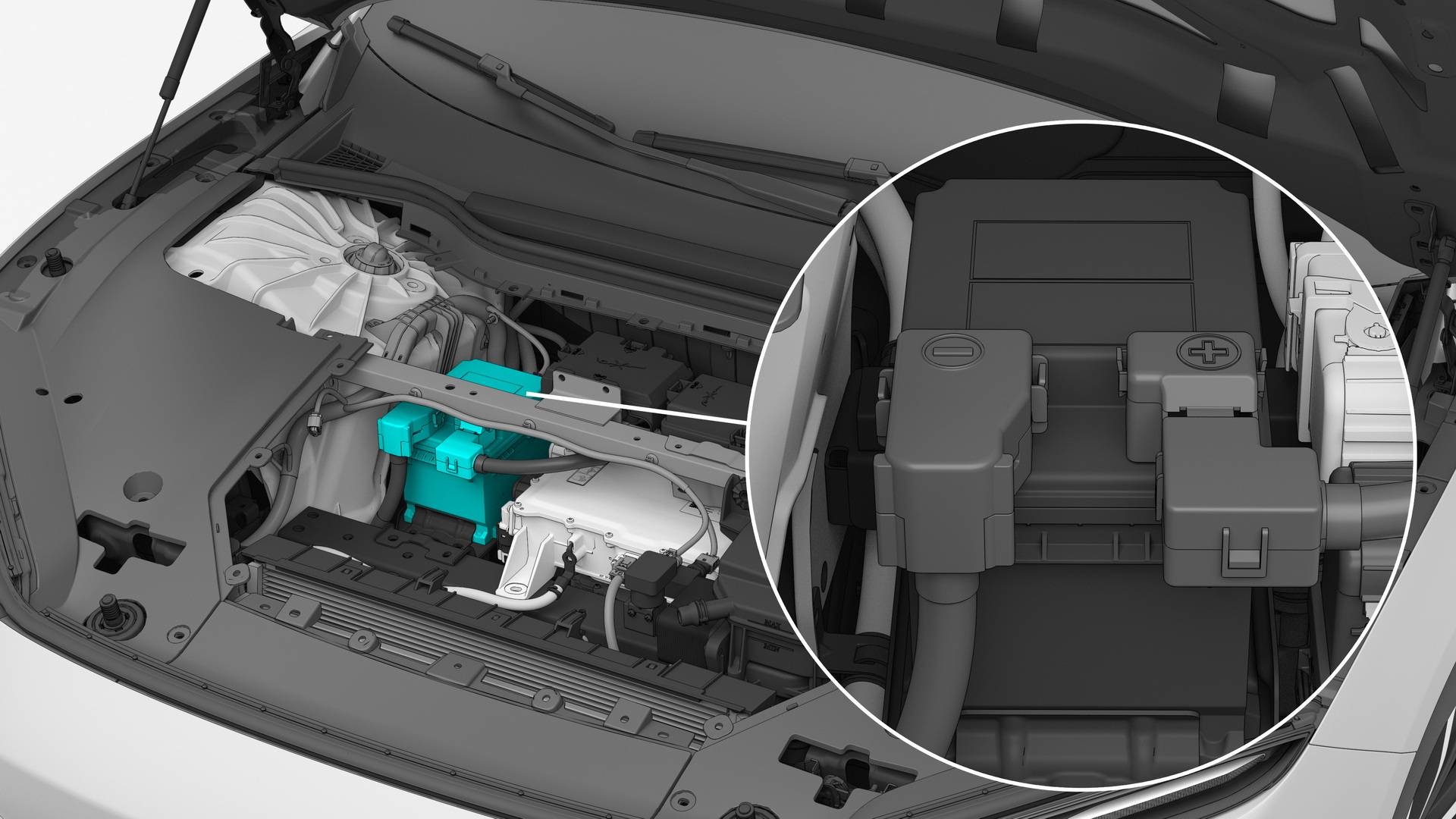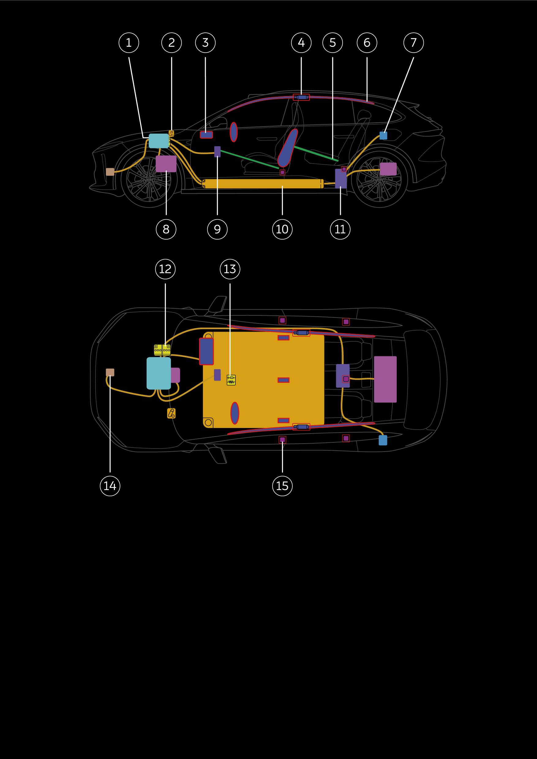 den in der Abbildung markierten Hochvolt- und Hochdruck-Hauptbereichen des Fahrzeugs wie zum Beispiel in der