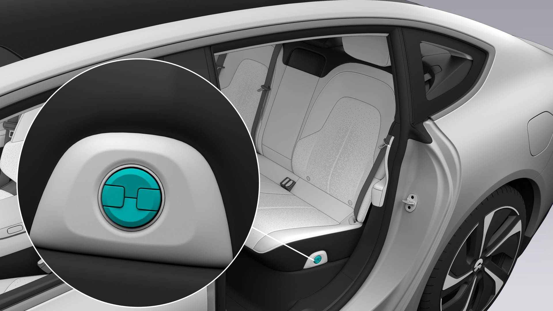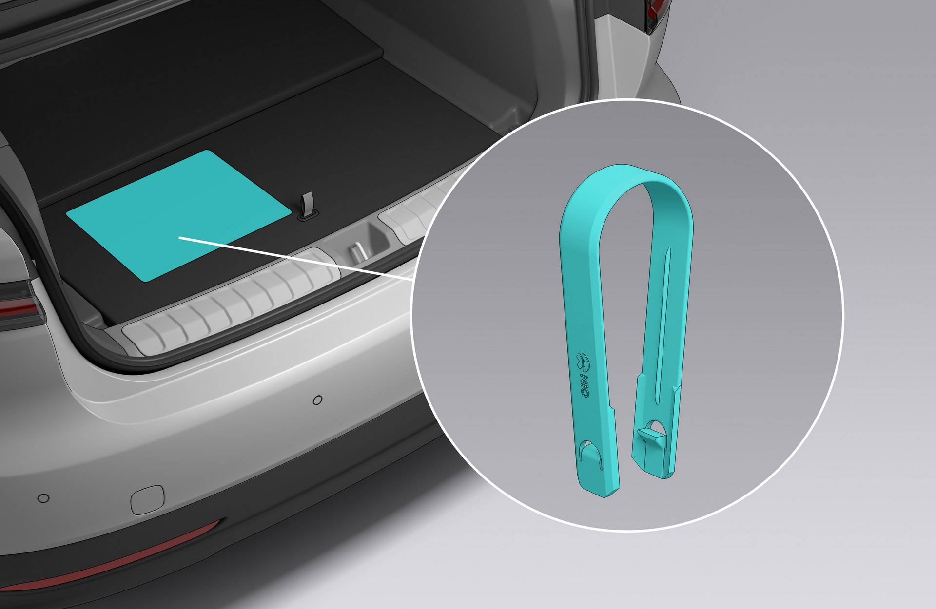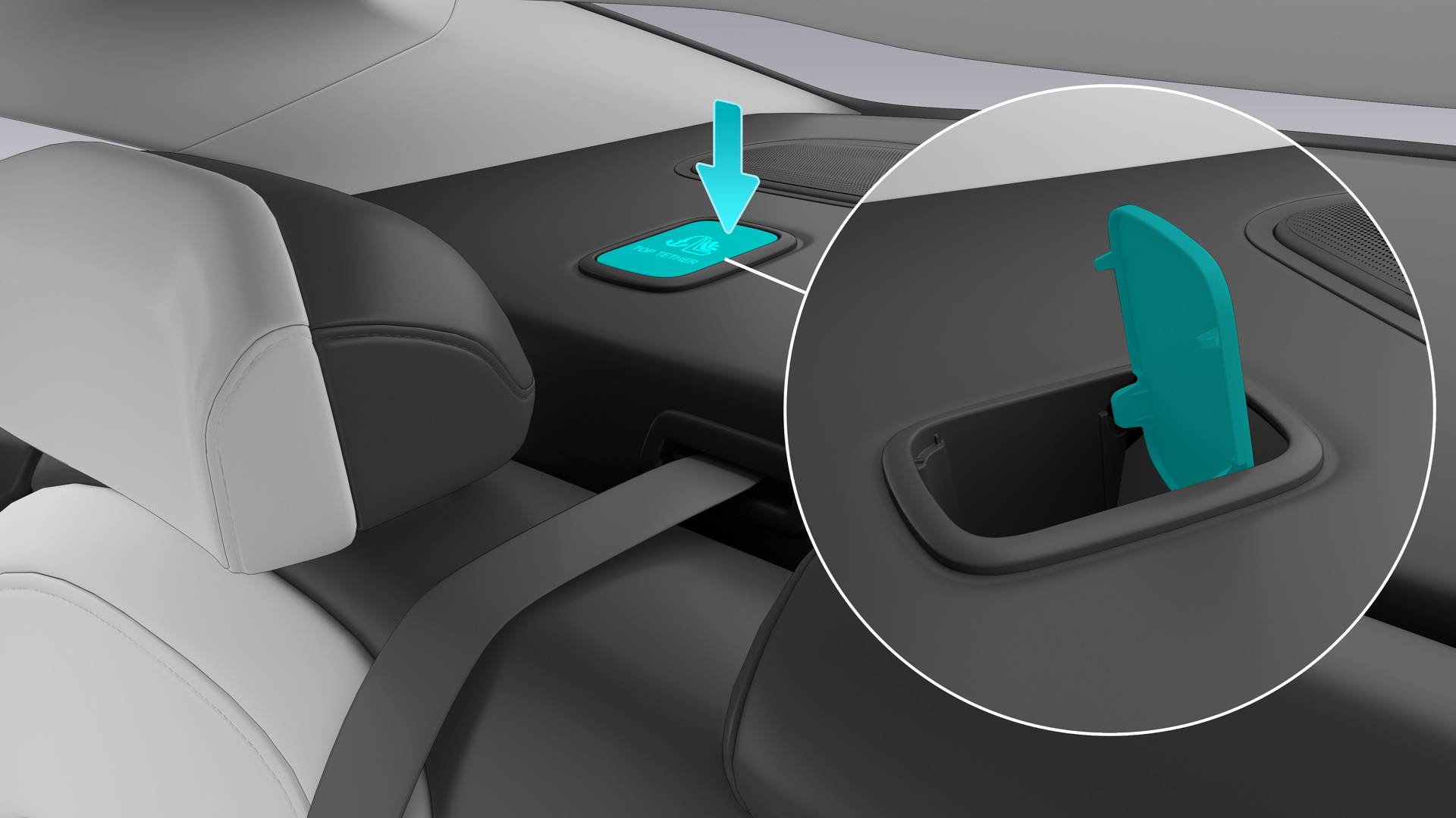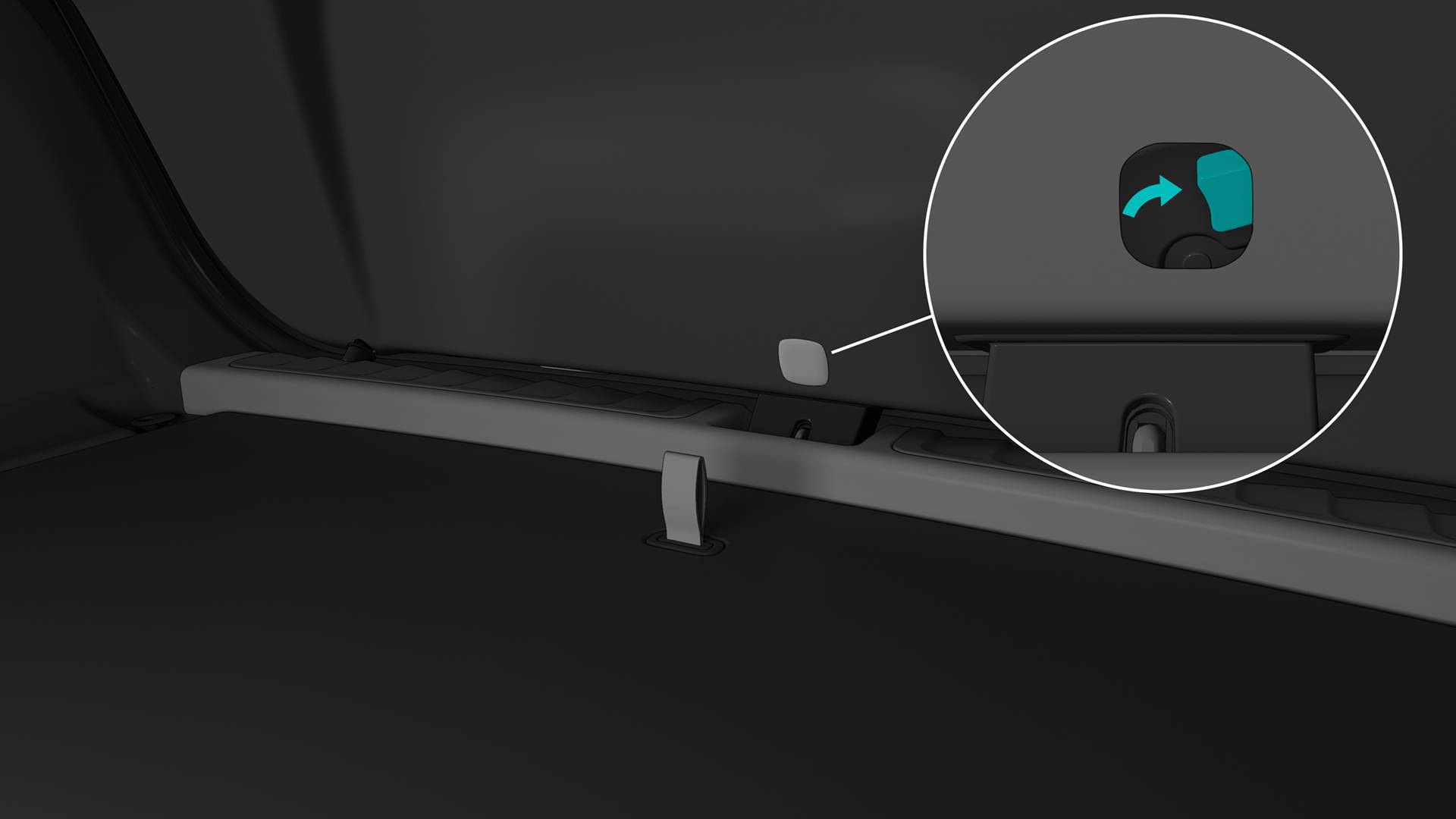Um die Heckklappe zu öffnen, heben Sie den quadratischen Block über der Schlossschnalle von der Innenseite des Kofferraums aus an und drücken Sie dann mit dem Finger auf den Knopf in der Öffnung.