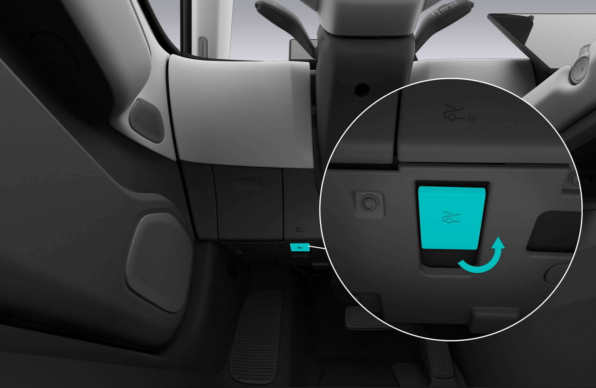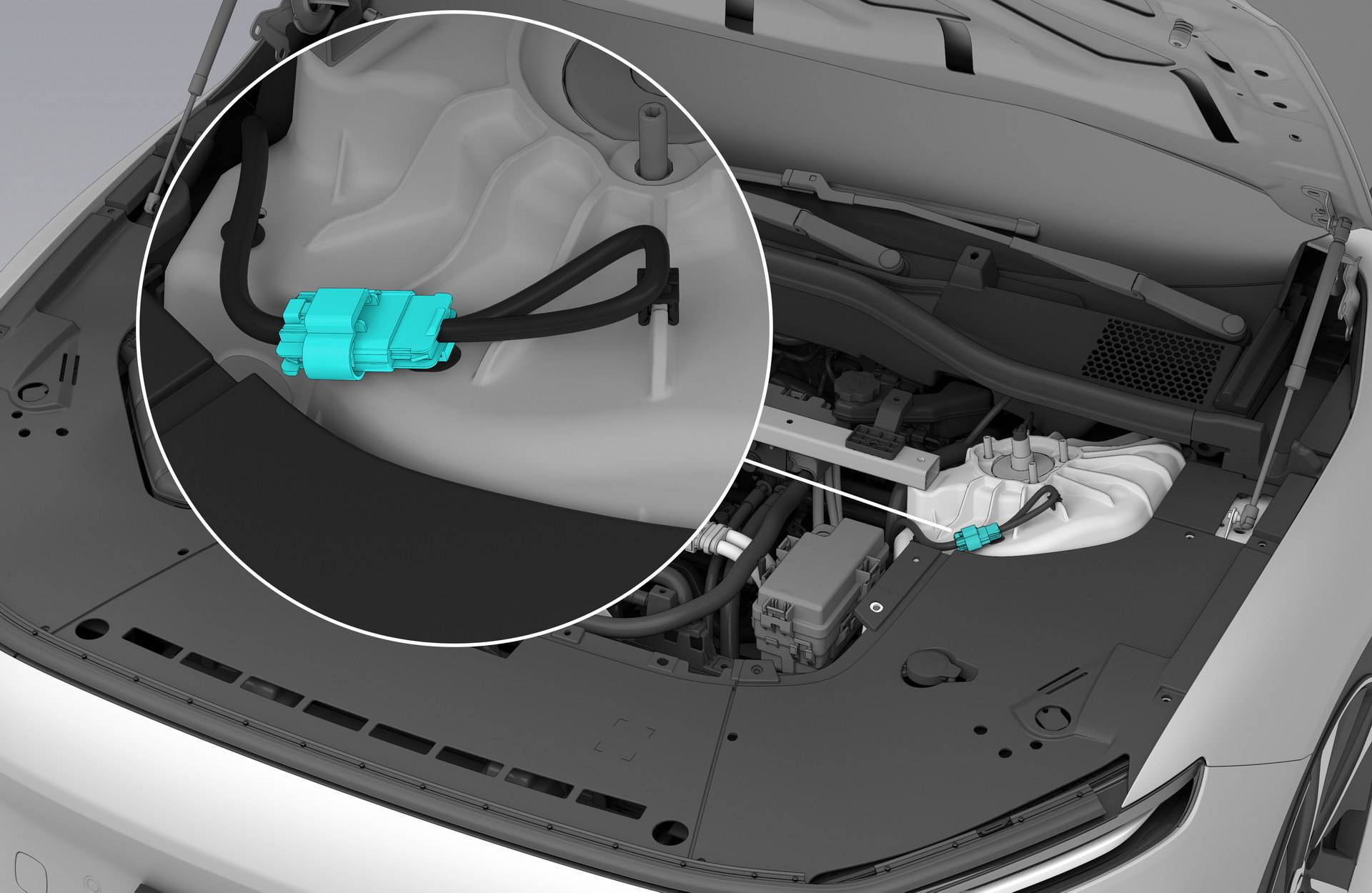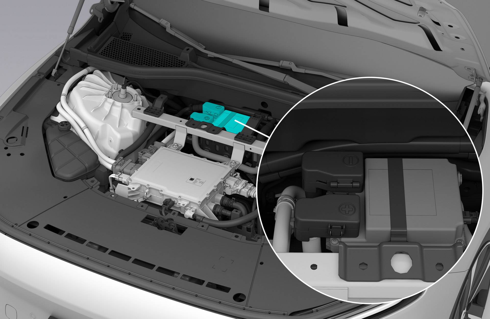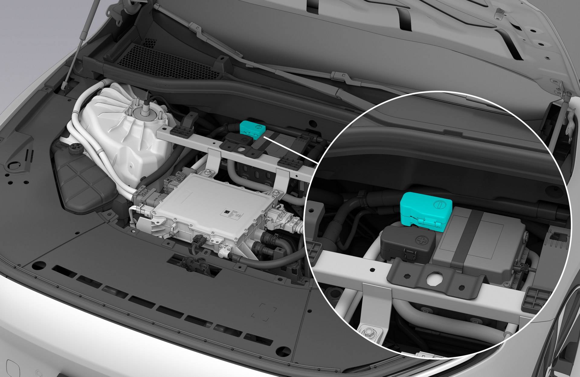 Stellen Sie die Fahrzeuge in den Parkmodus, schalten Sie den Strom der 12-V-Batterie ab, stellen Sie sicher, dass das Starthilfekabel korrekt an das Bordnetz angeschlossen ist und öffnen Sie die Motorhaube von Fahrzeug A, um die 12-V-Batterie zu finden.