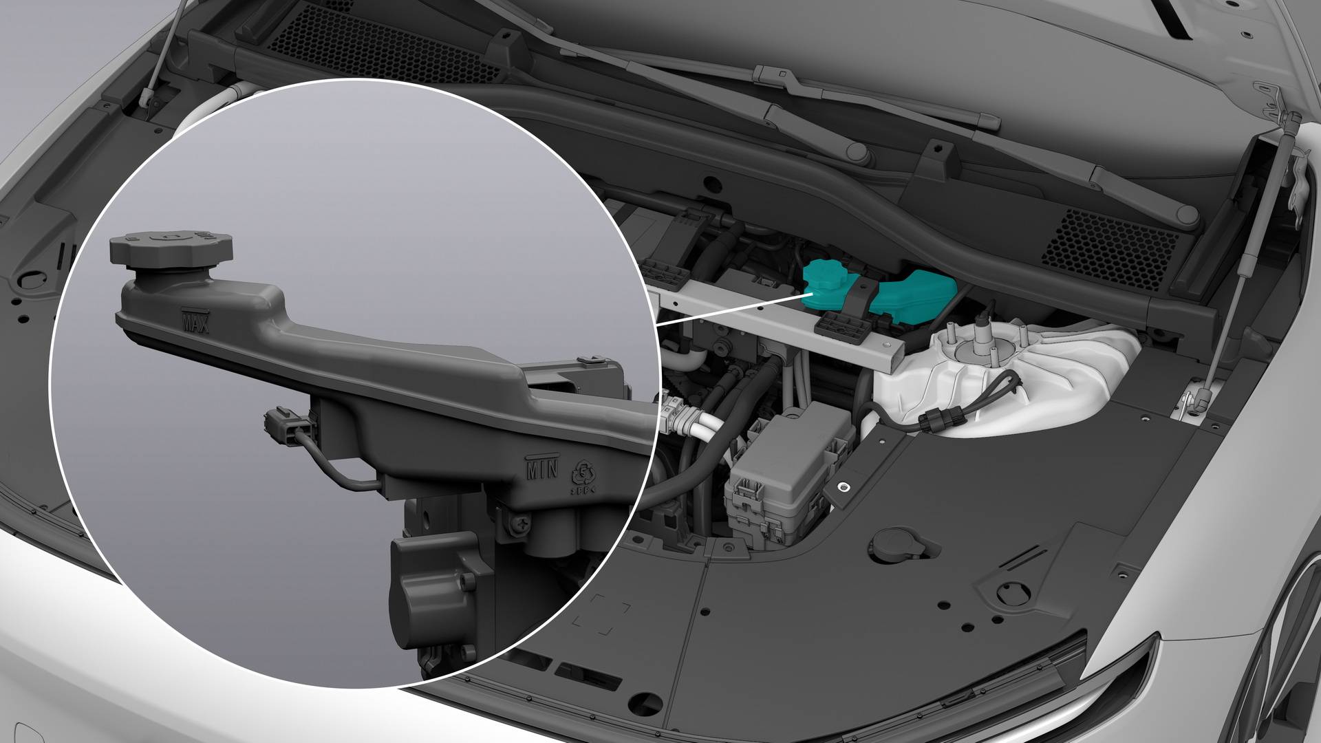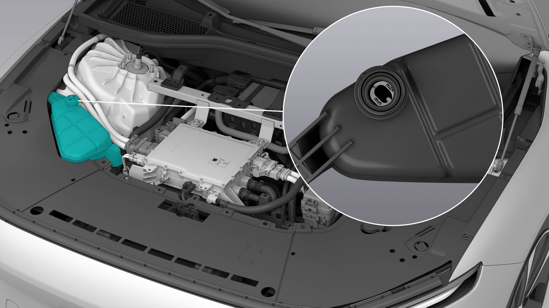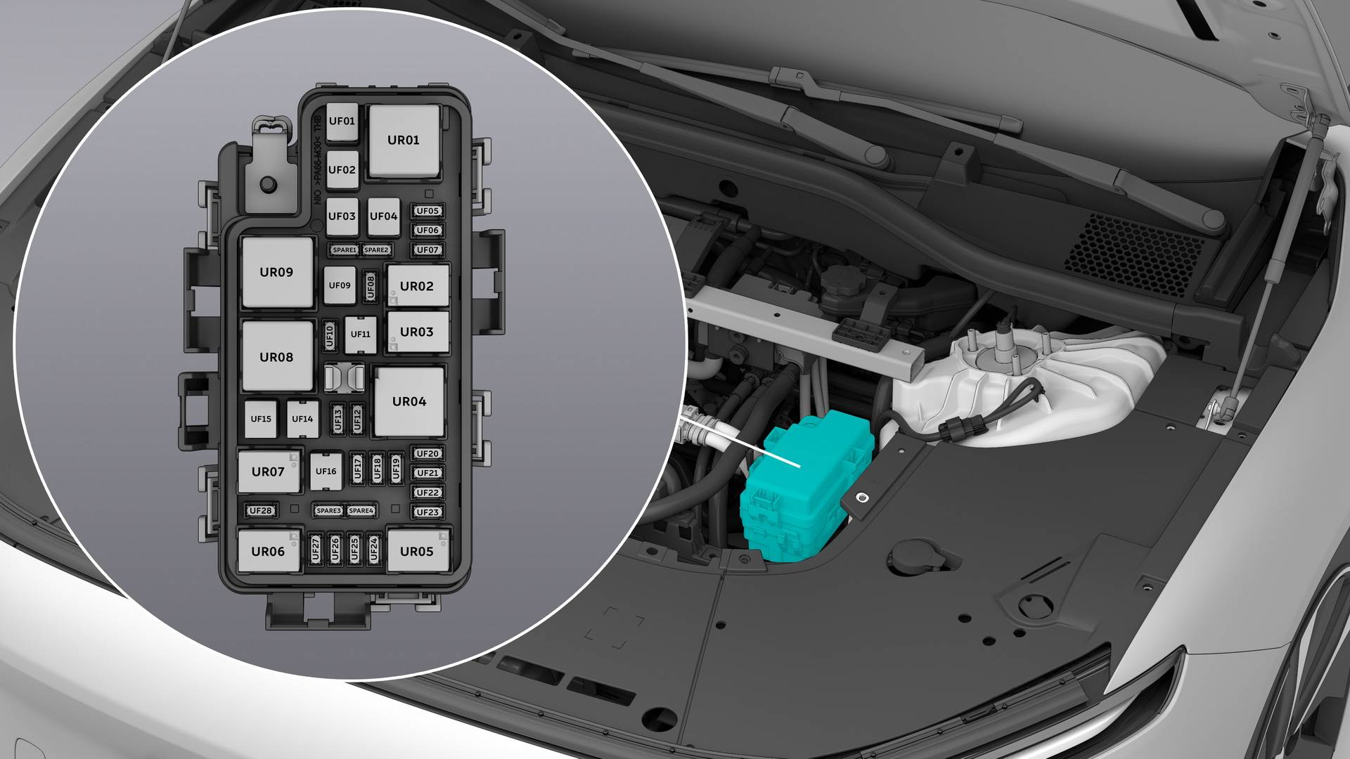 Um den Hochspannungskreis zu unterbrechen, ziehen Sie erst den Stecker der Hochvolt-Notabschaltung (im linken Bereich unter der Motorhaube) ab und dann das Kabel, das am Minuspol der 12-V-Batterie angeschlossen ist (nahe der Windschutz-scheibe unter der Motorhaube).