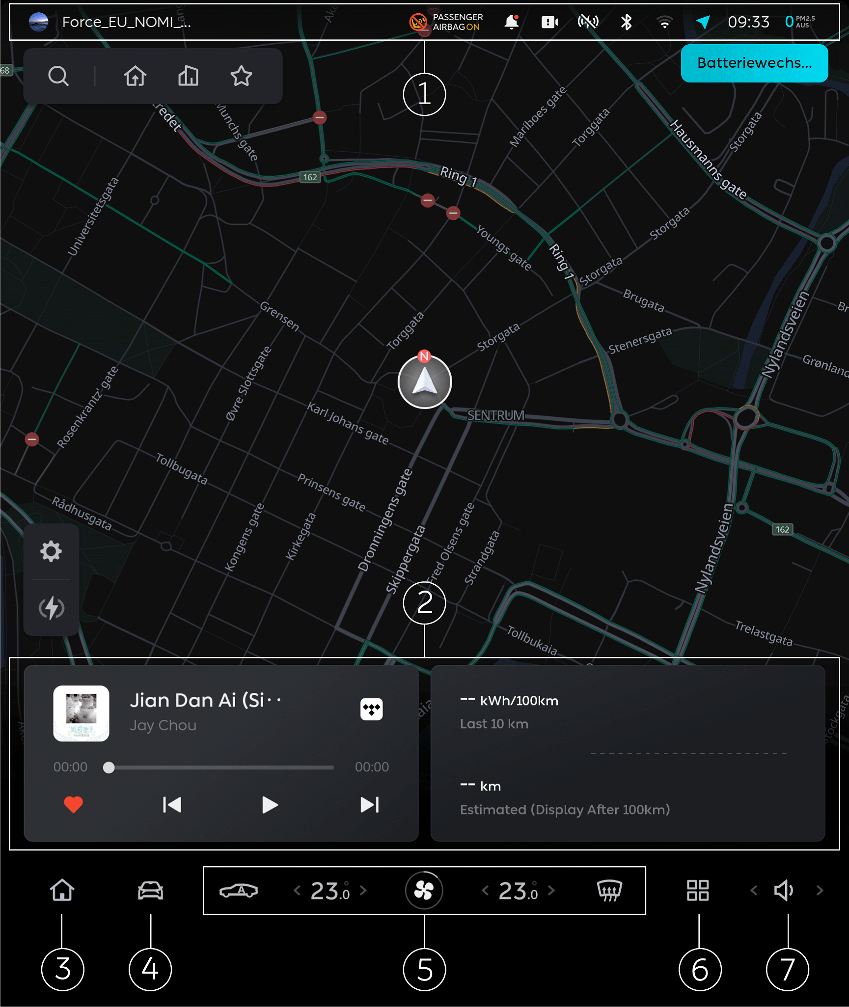 Halten Sie das Fahrzeug in PARK und betätigen Sie das Bremspedal, gehen Sie über die Steuerleiste unten im Center Display zu Einstellungen und tippen Sie auf Fahren > Abschlepp-/Waschmodus. Die Feststellbremse wird gelöst und das Fahrzeug kann abgeschleppt werden. (Bitte verwenden Sie entsprechende Bremskeile, um ein Abrutschen zu verhindern.)