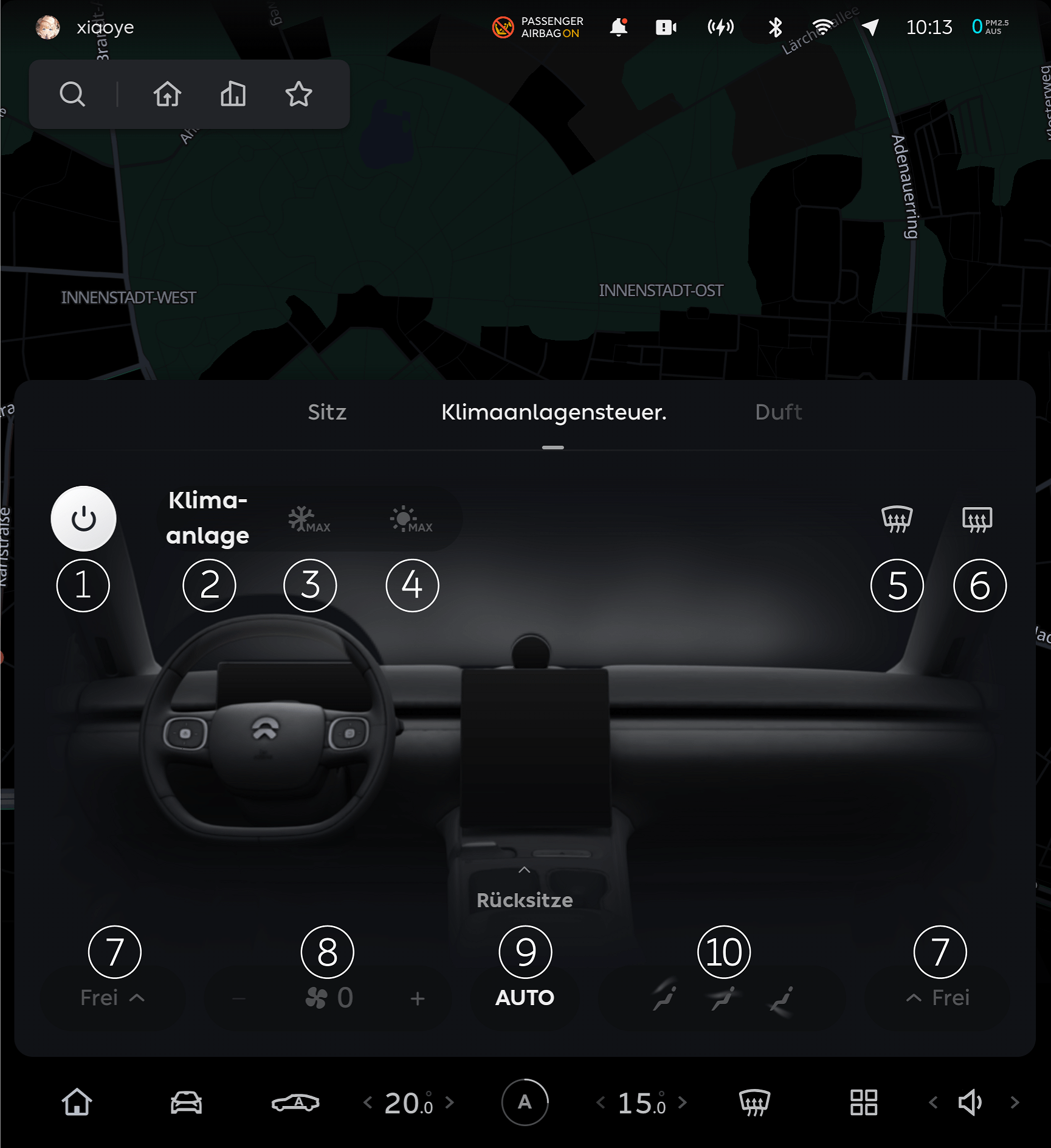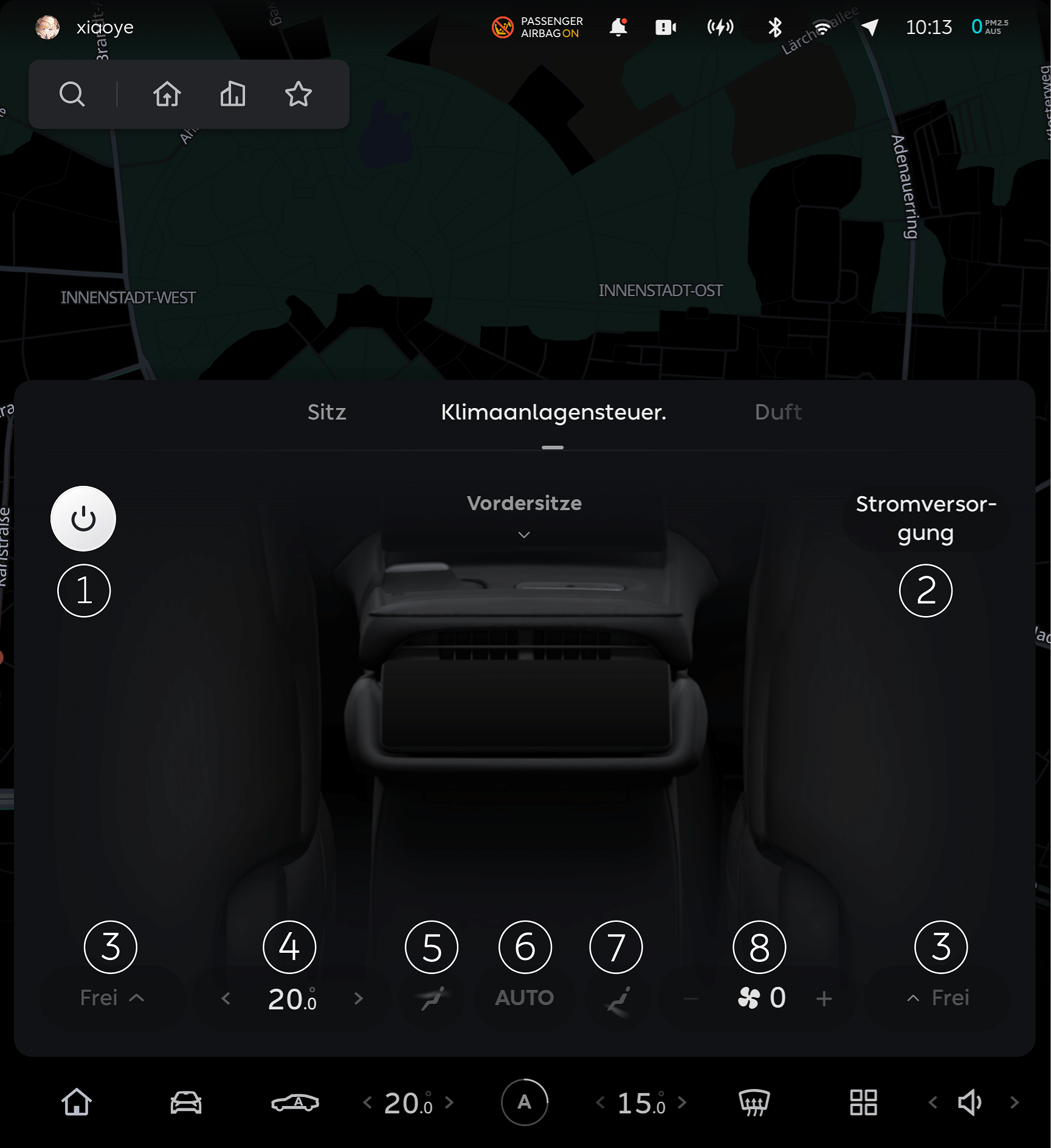 Sie können die Entriegelungsmethode für den intelligenten Schlüssel am Center-Display einstellen: Öffnen Sie über die Bedienleiste unten im Center-Display die Einstellungen und tippen Sie auf Tür- und Fensterverriegelungen > Türen > Fahrzeugentriegelungsmodus.